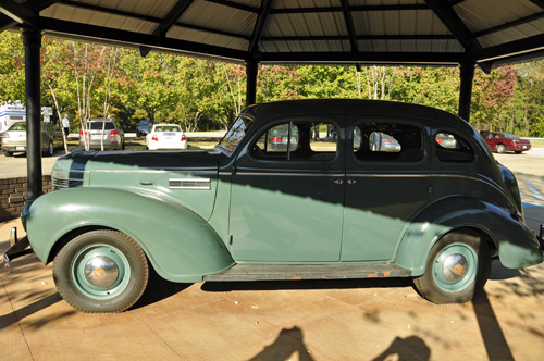 Below: A 1939 green Plymouth 4-door sedan, similar to the car in which Elvis and his family rode to Memphis in, is displayed on the grounds. It was the year of 1948 when the transformation of Elvis, as a young Tupelo boy began his journey as Elvis, the world's greatest entertainer. The car was purchased by the Tupelo Automobile Museum and is leased to the Park for display. |