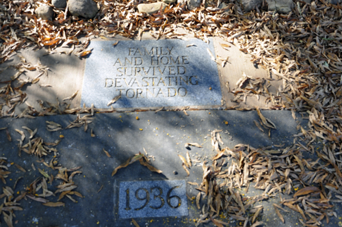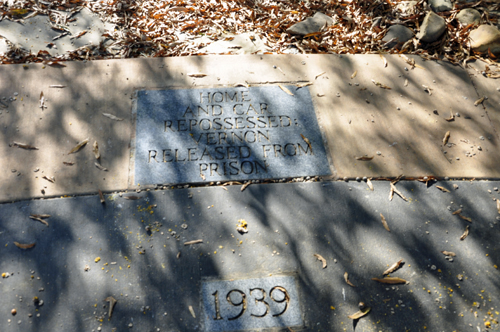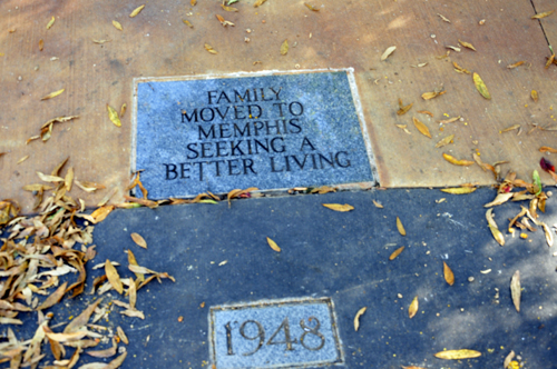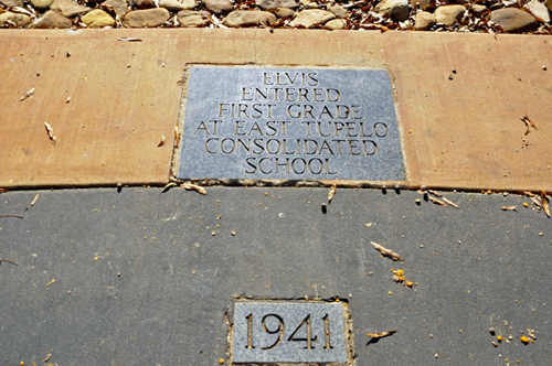 Below: The Walk of Life which surrounds the house where Elvis was born, is a scored concrete circle with dated granite blocks denoting each year of Elvis' life from 1935 to 1977. The 1948 block marks the year in which Elvis and his family left for Memphis. |