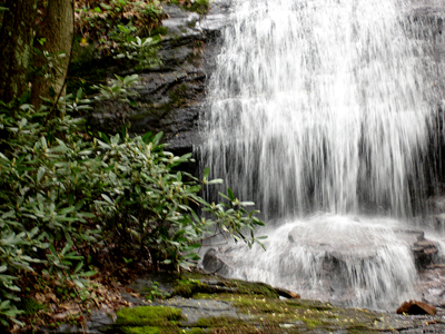 | The upper falls (shown below) are the actual DeSoto Falls . The ascent is easy, rolling up and down, broken by long flat stretches in deep wood groves. Occasionally the visible creek makes a soothing gurgle and the falls themselves are worth the trip. Just before you reach these falls you cross a bridge, then turn into the side cove containing the falls. A brief ascent takes you to the observation deck. | |