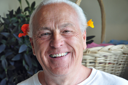 | As stated above, Lee and Karen Duquette returned to Talkeetna for an overnight stay on July 28th just to have lunch and dinner at Cafe Michele again. Below: The lunch salad and a very happy Lee Duquette with the flowers from the salad in his hair. | |